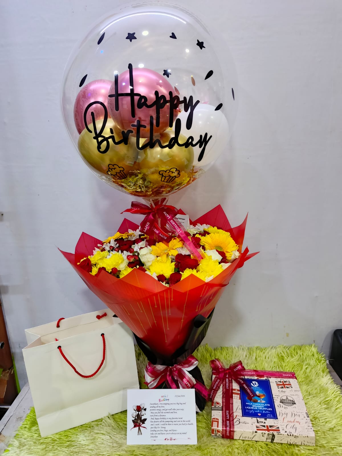 Surprise your loved one with a beautiful bouquet, a personalised Bobo balloon, and delicious chocolates all in one perfect gift.