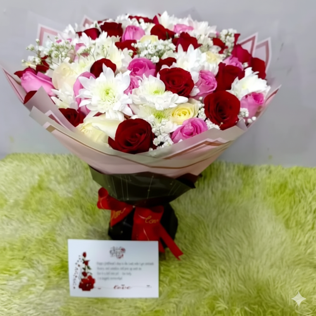 Brighten any moment with a beautiful mixed bouquet of fresh seasonal flowers, hand-arranged for a colourful, elegant gift. Perfect for birthdays, love, congratulations, and everyday surprises. Order from Lotus Flower Shop for same-day delivery in Meru