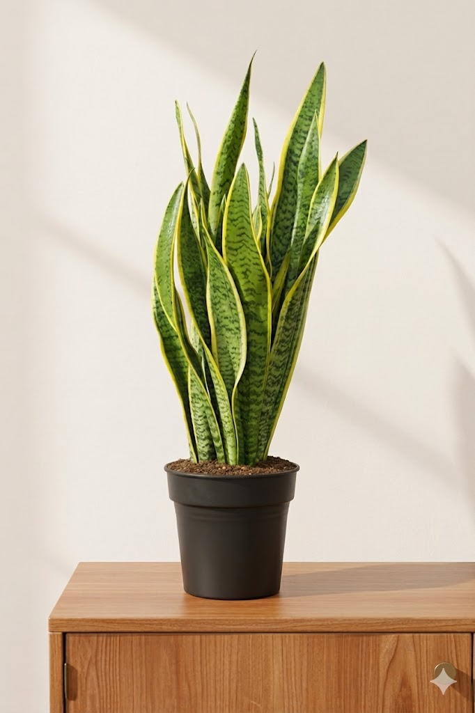 The Snake Plant (Sansevieria) is a hardy, low-maintenance indoor plant perfect for homes and offices. Known for its upright green leaves, it thrives in low light and requires minimal watering ideal for beginners. This air-purifying plant adds a modern, stylish touch to any space.