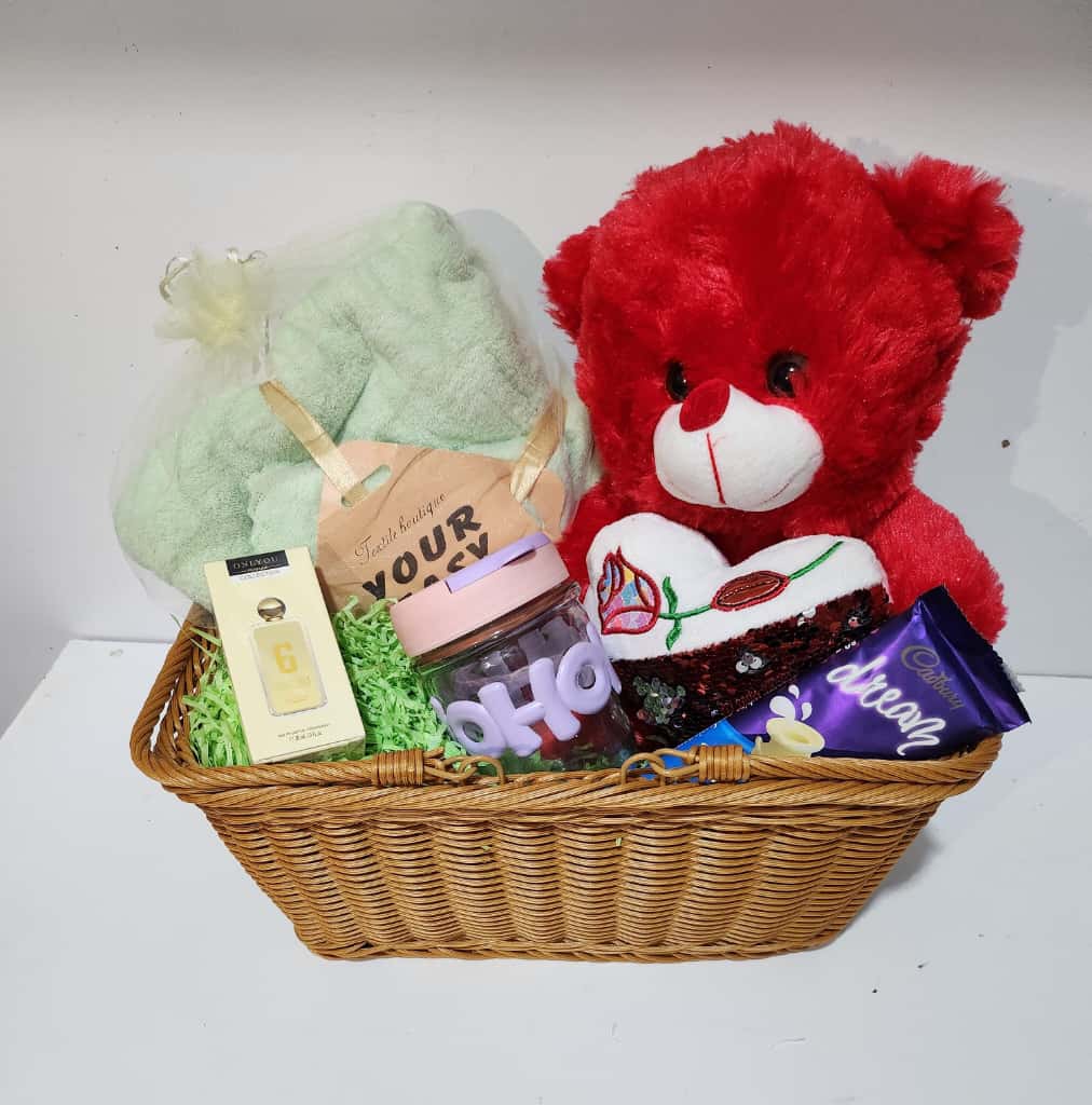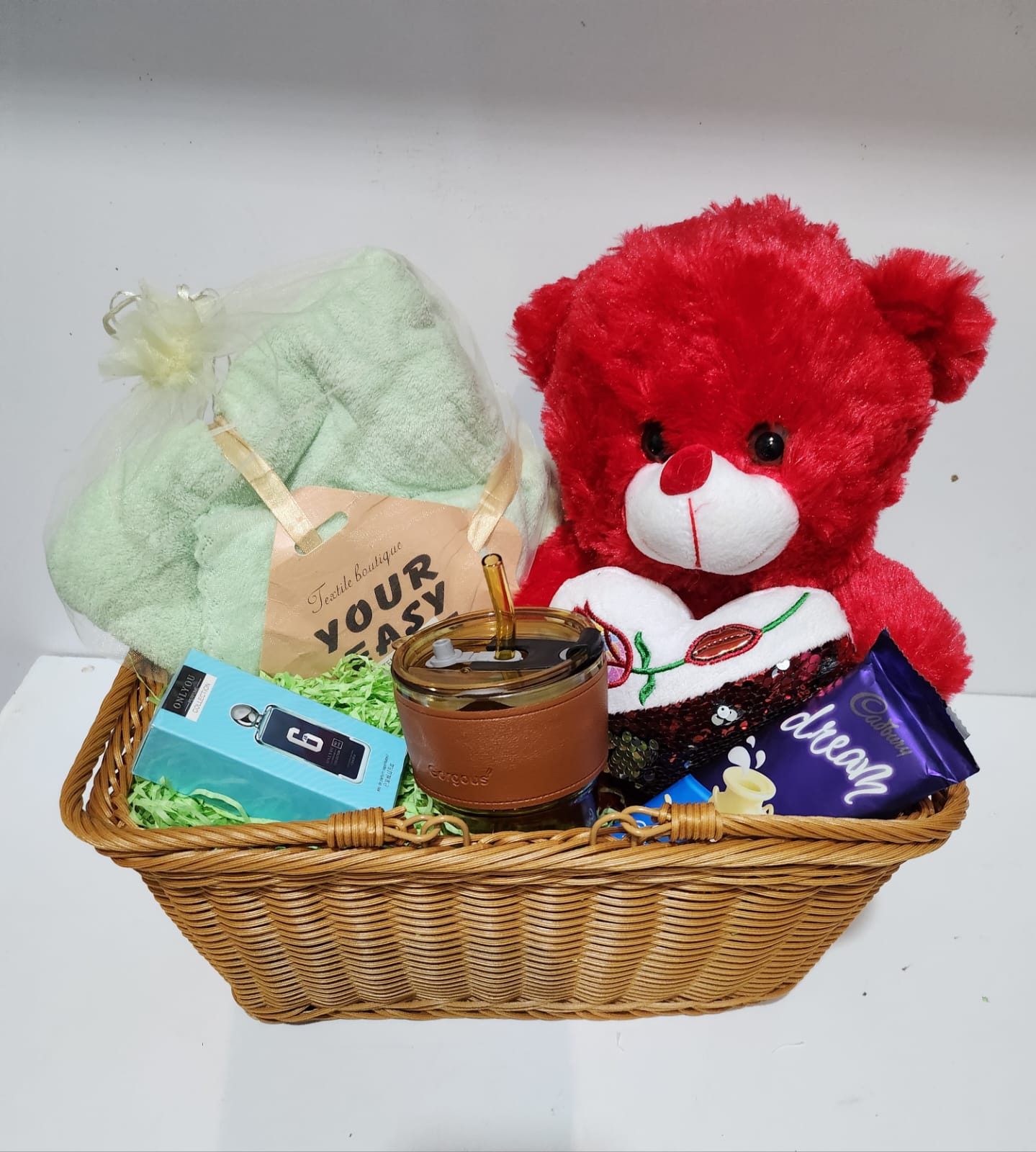 This beautifully arranged gift hamper includes a cute teddy bear, perfume, bath towel, dry hair towel, glass mug, and chocolates in a stylish straw basket—perfect for showing love and appreciation.