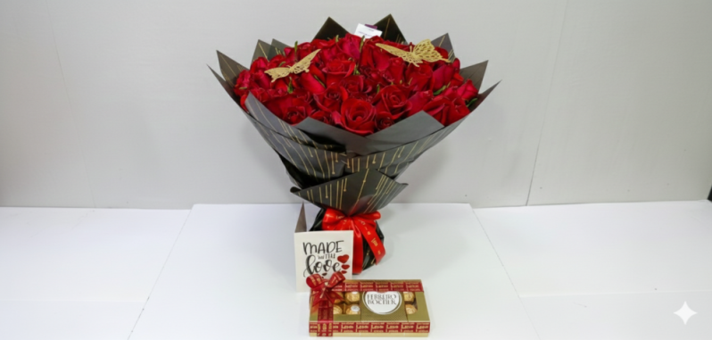 The Valentine package features;Â premuim red roses and and fererro rocher chocolate